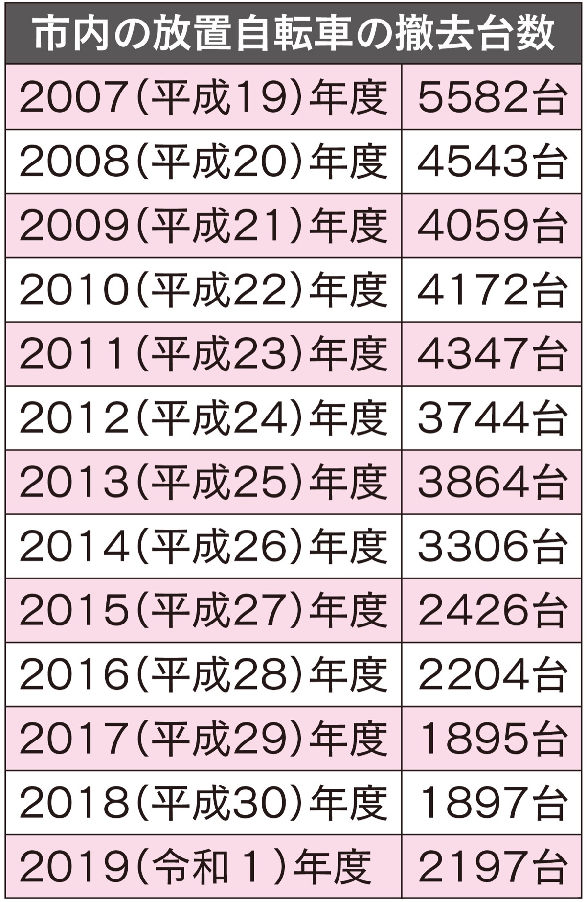 駅前の禁止区域をはじめ、市民からの指摘によって撤去した市内の放置自転車の台数は2017年度が1895台、18年度が1897台、19年度は2197台だった。市道路交通課によると、放置自転車対策として、これまで平日を中心に撤去を行っていたが、昨年から土曜や夜間も実施しており、その分台数が増加したという。