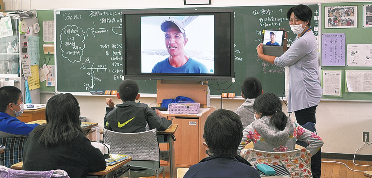 当日は、5年生の2クラス47人が授業に参加。オンラインで小野さんとつながると子どもたちから歓声が沸いた。小野さんが父島の天気や気候、経歴などを紹介。メカジキを専門に漁を行っていることや、船の中、使っている道具、船上での生活などをカメラで映しながら説明をすると、子どもたちは「すごい」という感想を漏らしていた。また「船の上で寂しくないか」「魚を釣るまで何をしているのか」「今までで一番大きな魚は」などの質問が寄せられると、小野さんは「寂しいよりも必死」「音楽を聴いたり、寝て体力を回復させている」「235kgのマグロ」と笑顔で答えた。