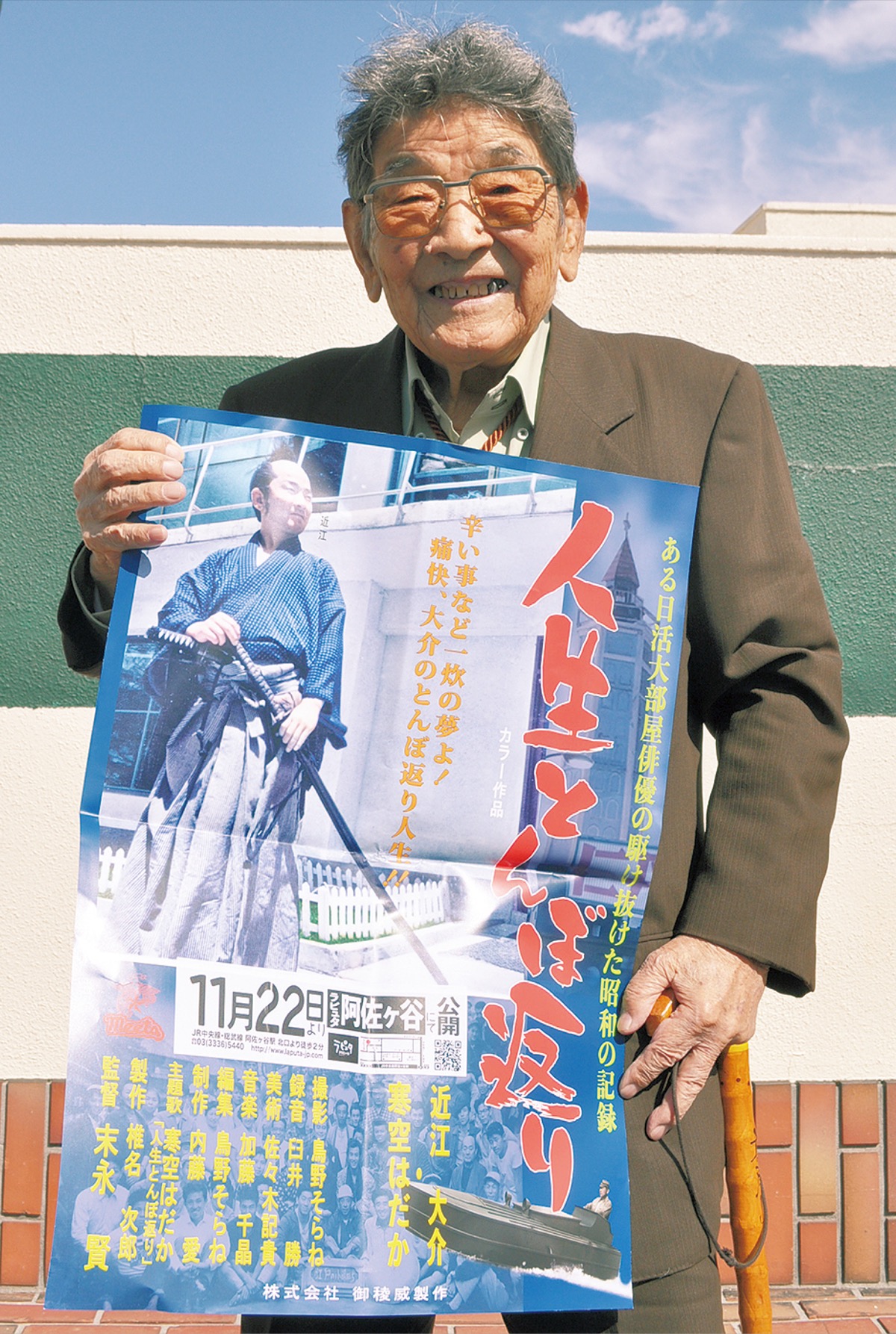 日活の大部屋俳優・近江大介として活躍した中山善助さん(92)=愛宕在住=が主演を務める映画『人生とんぼ返り』が11月22日(日)からラピュタ阿佐ヶ谷(JR中央線・総武線阿佐ヶ谷駅北口から徒歩2分)で公開される。石原裕次郎や月丘夢路ら、昭和を代表する大物俳優・女優らが主演を務める作品の数々に脇役として出演してきた中山さん。今回公開される映画は、92歳にして初の主演。公開を前に中山さんは「脇役が主役になるなんて驚きですよ」と笑顔で語る=中面・人物風土記で紹介。