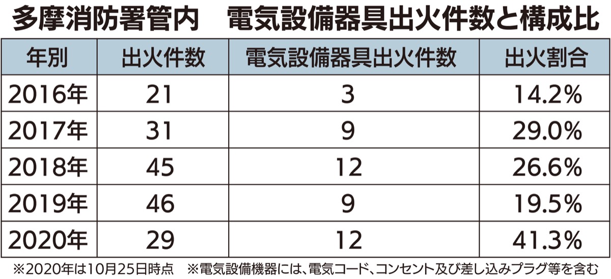 一方、多摩署では昨年1年間の火災件数は46件(前年比1件増)。主な出火原因は、たばこが7件(同2件増)、放火が7件(同5件減)、電気設備器具関係が9件(同3件減)だった。今年に入り、10月25日時点で出火件数は29件で、たばこが3件、放火が3件。電気設備器具関係が12件と昨年1年間よりもすでに多くなっており、全体の割合でも41・3%。最近5年で最も高い割合となっている。