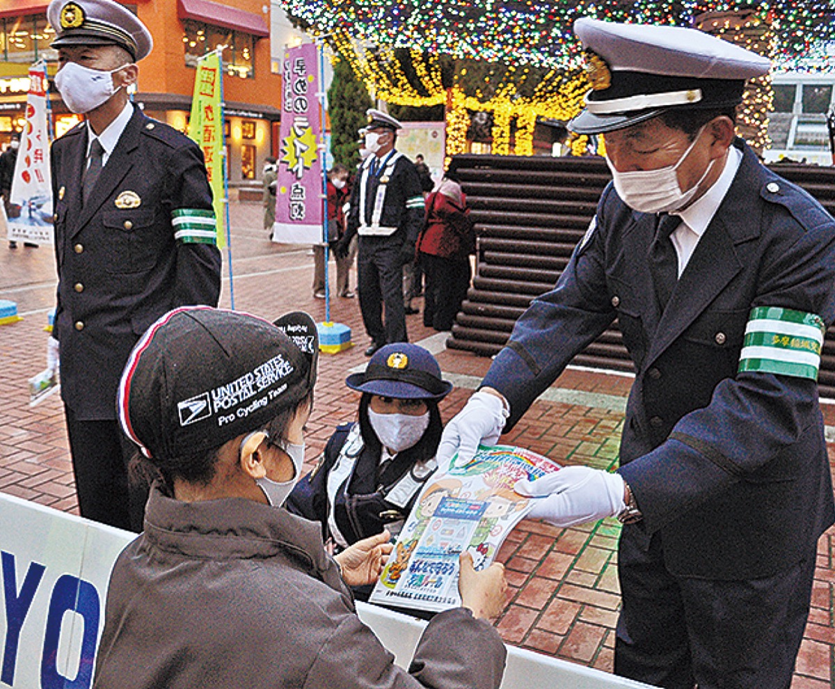 多摩中央警察署(岩井文丈署長)は12月5日、多摩稲城交通安全協会らとパルテノン大通りココリア前十字路で「TOKYO交通安全キャンペーン」の一環として、「クリスマスイルミネーション反射材着装キャンペーン」を実施した。