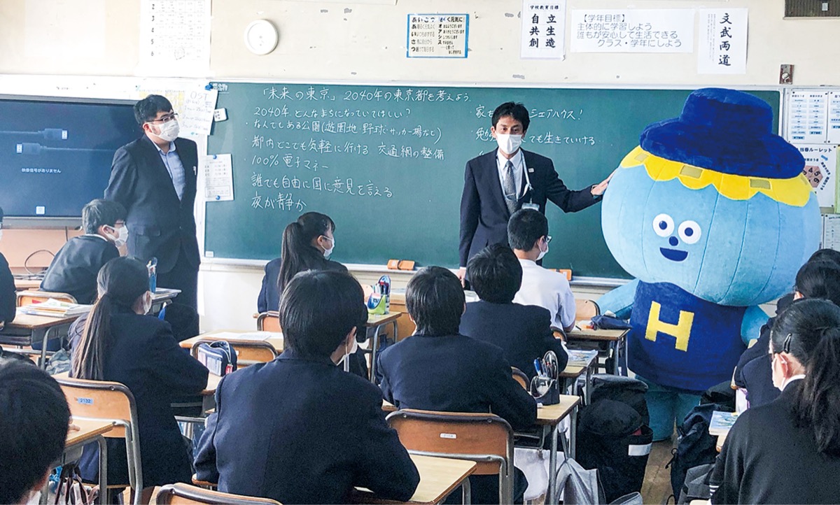 授業では、これまで取り組んできた「ESD(持続発展教育)」や「多摩市の未来を考える」、学校の伝統である「チョボラ」(ちょっとしたボランティア)について振り返り、同ビジョンの子ども向けの冊子や、動画を紹介。都が用意したワークシート「2040年の東京はどんなまち?」に、生徒たちは「一戸建てが減り、高層マンションに住む。空き地が増え、森林となり、CO2が削減される」「排気ガスなど、空気の汚れがまったくない都市」などそれぞれが抱く未来の東京のイメージを書き込んでいった。最後には、江東区にある水素情報館「スイソミル」のイメージキャラクター「スイソン」が来校し、記念撮影を行った。