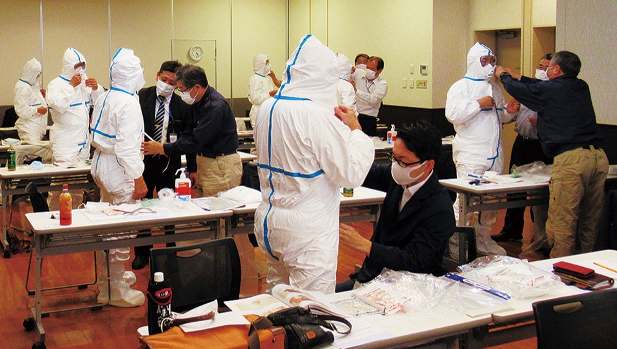 当日は、多摩市内から3事業所約30人が参加。杏林大学医学部高度救命救急センター救急医学教室の山口芳裕教授を講師に迎え、コロナに関する講演と、感染防止用個人防護具の着脱の実技などを中心に実践的な内容で実施された。また多摩消防署救急隊の感染防止措置や消毒などの取り組みについての紹介も行われた。