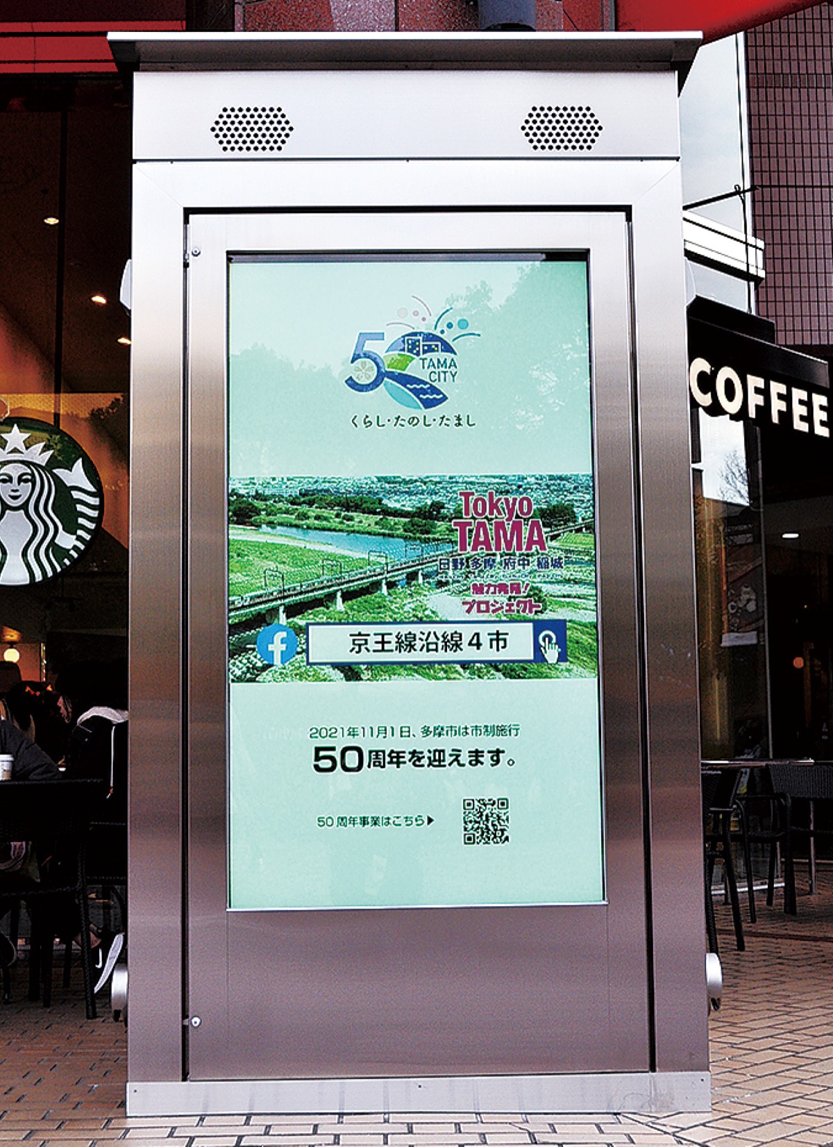 多摩市はこのほど、多摩センターのペデストリアンデッキに初めて観光向けのデジタルサイネージを設置した。
