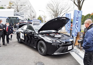 市内に本社を構える「トヨタ西東京カローラ(株)」(関戸・舟橋竹彦代表取締役社長)と、「多摩興運(株)」(南野・小礒トシ代表取締役社長)は12月10日から13日まで、多摩興運が運営するTKK水素ステーション(南野)で、水素自動車「MIRAI」の新型車の展示会を行った。同車は、9日に新型が発売されたばかりで、全国でも先駆けて多摩の地で一般にお披露目された。舟橋社長は「多摩から水素社会の実現に向けて一歩を踏み出していきたい」と意欲を見せた。