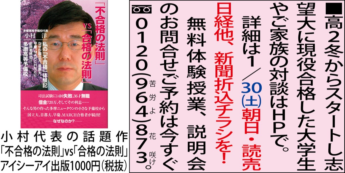 しかし「スタートが半年遅れれば、いくら地頭のよい生徒でも、その能力以下の大学に進学するか、浪人せざるをえなくなります。佐藤くんや、相部くんはC点の学力で受験できたのです。もし現役合格を目指すなら、受験勉強は遅くとも高2の冬からスタートした方がよいでしょう(高1スタートなら、なお可)」。「国立大・首都大・上理・早慶MARCH・獣医・医・薬大など難関大学を目指すなら、この冬今すぐスタートをきるべきでしょう。あと1年しかありません。素早いスタートを」と小村代表。