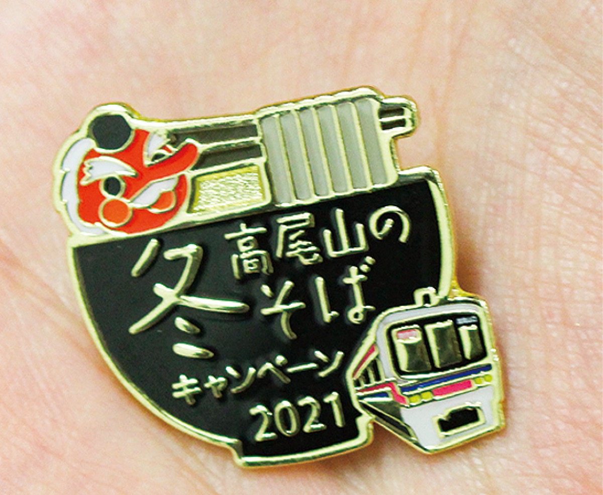 専用チラシは、京王線各駅などに設置してあるものを使用。ピンバッチの交換は、スタンプが2つ押された専用チラシを持参の上、高尾山口観光案内所「むささびハウス」まで。
