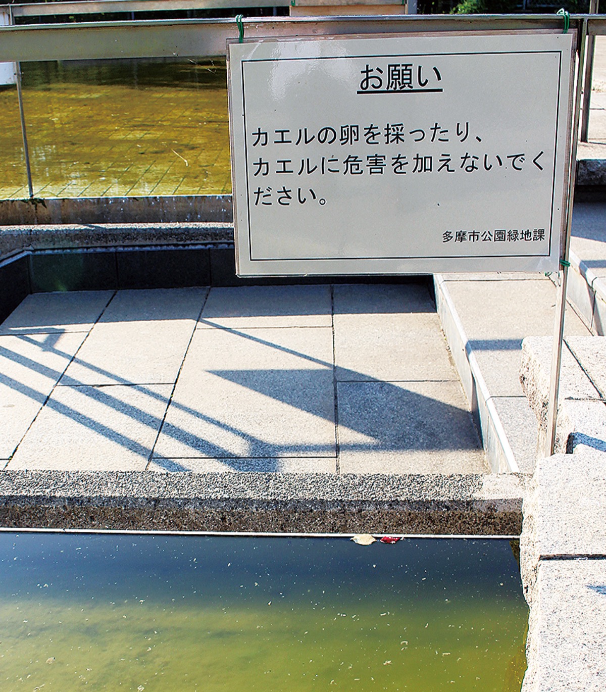 設置した多摩市によると、水の広場に生息するカエルをむやみに捕まえようとする人が増えているための処置といい、4月過ぎに設置したのだという。
