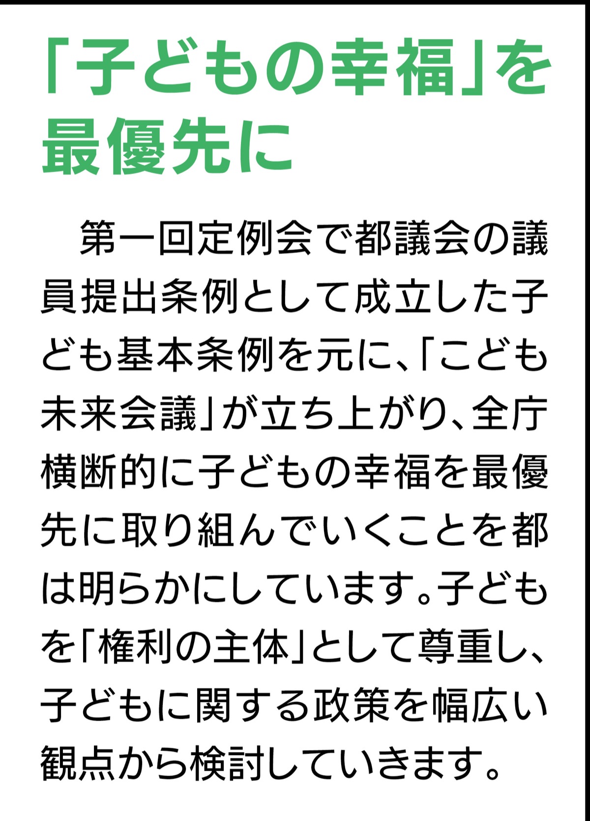 また、知事の所信表明では、私も共同提案者となり、全会一致で成立した「東京都こども基本条例」を元に、子どもを権利の主体として尊重し、子どもに関する政策を幅広い観点から検討するため、こども未来会議が立ち上がり、全庁横断的に子供の幸福を最優先に取り組むとしました。