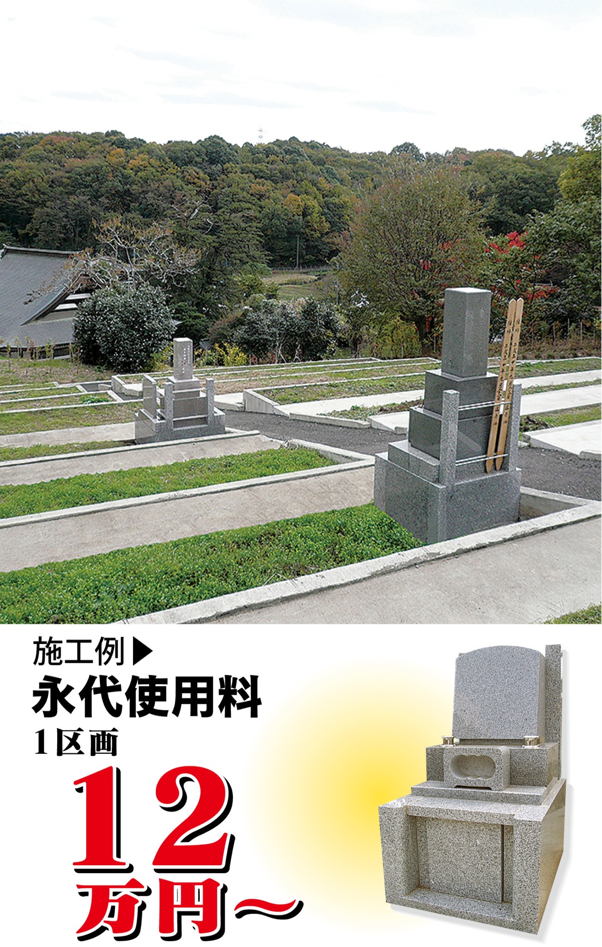 墓石は最高級の御影石を使用した(株)石栄(横浜市)の自社施工。デザインや大きさなどきめ細かく応える。永代使用料は12万円〜。仏様の有無、過去の宗旨宗派は問わない。本紙特典で工事費5万円引き。区画数限定。