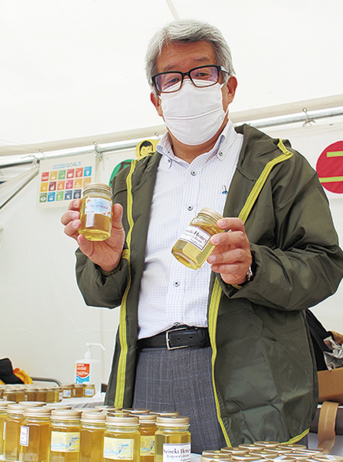一方で今回、地元野菜が並ぶブース近くには、多摩中学校のハチミツ販売テントが登場。生徒らが養蜂活動を通じて採取したハチミツを同校の千葉正法校長らがお客さんに手渡す姿がみられた。千葉校長は「生徒らに環境や、起業家精神を学んでもらうために始めた取り組み。たくさんの方に購入頂け良かった」と笑顔をみせ、「聖蹟地区の名物にしたいね」と手元の瓶詰されたハチミツを見つめていた。