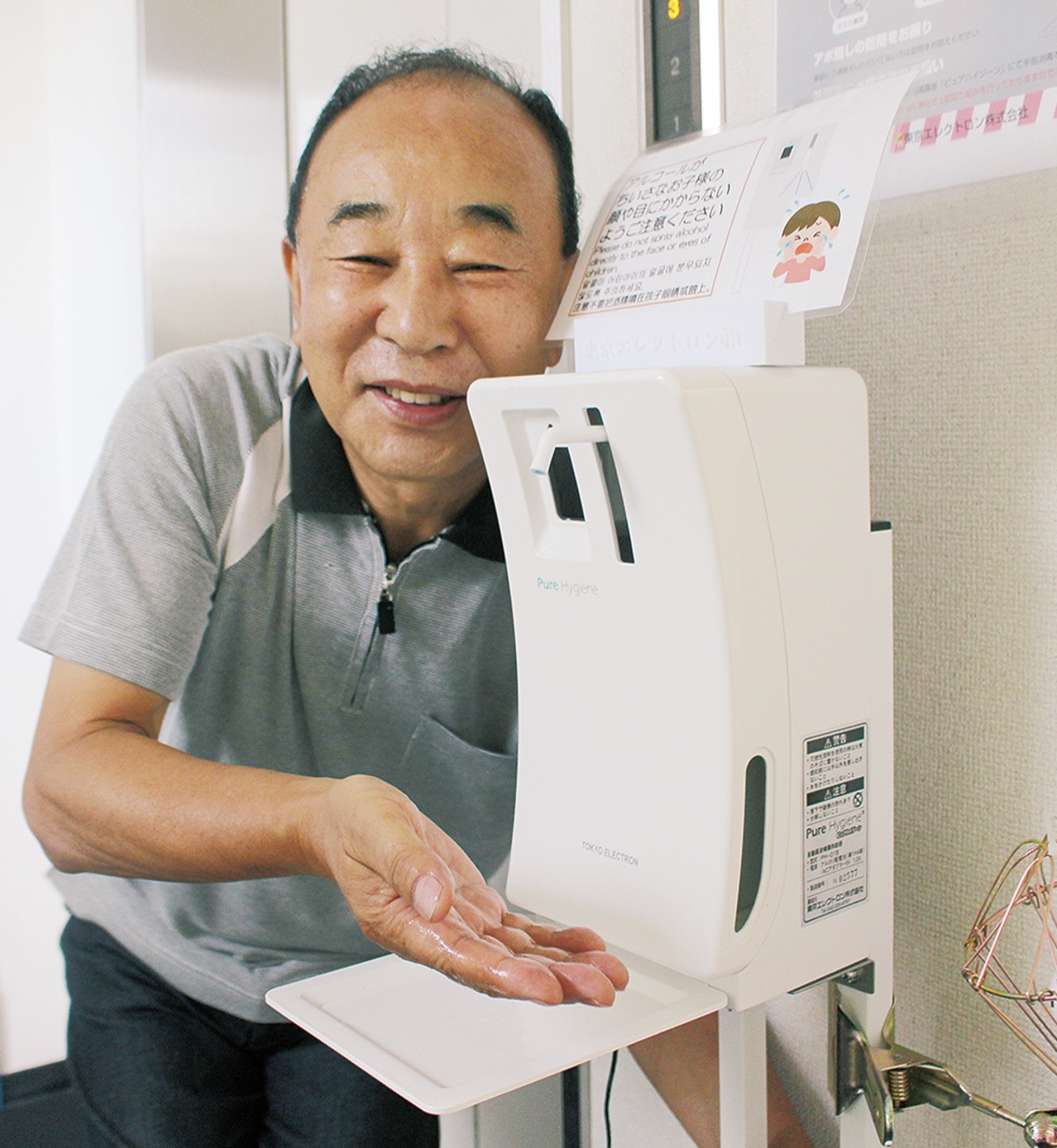 井上社長は「しかし、未だコロナ前の2割程度の売上程度。同じ商品を取り扱う子会社ともども苦戦が続いています」と苦い顔。一方で元々取り扱いのあった手を消毒するための「噴霧器」が昨年来、コロナ対策として発注が増え、ハンドドライヤーの売上減分を補ってくれているという。「今は新たな商品を考案中。今後も皆さまのお役に立つ商品をと考えています」