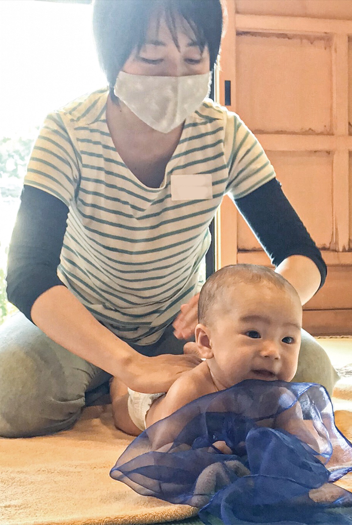 和田の大乗寺で11日、初めてベビーマッサージ教室が開かれた。当日は生後1歳に満たない赤ちゃんとその母親の3組が参加。主宰する高橋優子さんの指導のもと、母親たちは赤ちゃんに言葉を語りかけながら子どもの身体をマッサージ=写真=。照れたような顔を浮かべ、手のひらを当ててくれる母親を見つめる赤ちゃんたちの姿がみられた。
