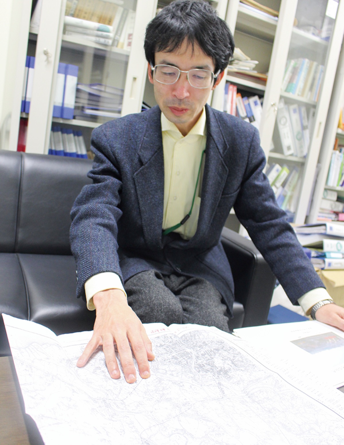 平野さんが大学周辺を多摩ニュータウン開発が進む以前の様子が分かる地形図でみてみると大栗川周辺にある谷斜面に面するところなどに日向や日影という地名が多数分布。地理情報システム(GIS)を基に冬至時期の日照時間の分布図をつくり、日向と日影の地名分布と重ね合わせてみると、日向は日照時間が長い南向きの斜面に。日影は北向きの斜面の崖下などに位置していることが分かったという。