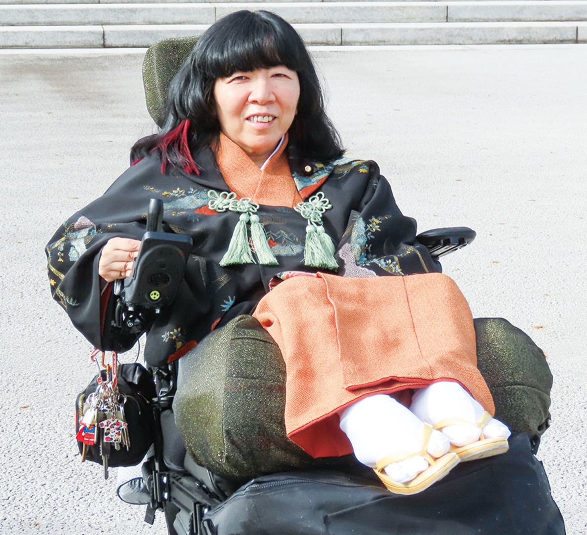 重度の障害がある多摩市在住の参議院議員、木村英子さんが先月、橙色の生地に小さな梅の模様が入った着物に黒地の被布を羽織り、国会の開会式に出席した。