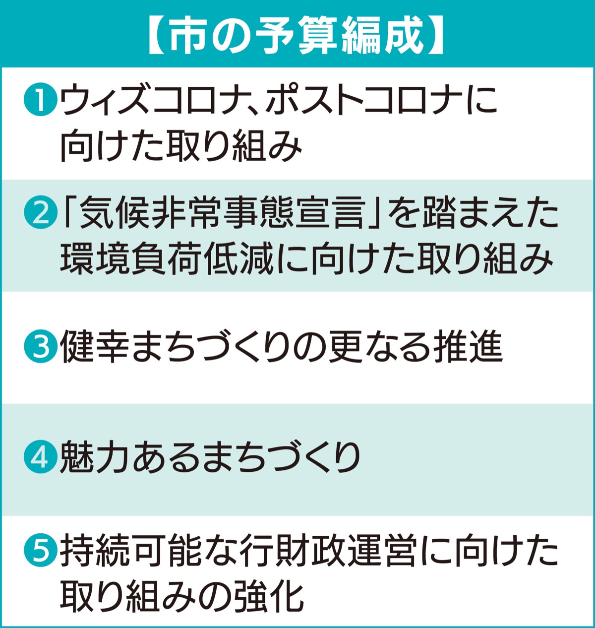 市は予算編成を主に5つに分けた。コロナ対策にあてるものや、20年に発表した「気候非常事態宣言」を踏まえた環境負荷の低減に向けた取り組み。また、コロナ禍における健康二次被害の防止対策などを含む健幸まちづくりの更なる推進――などの5つ。