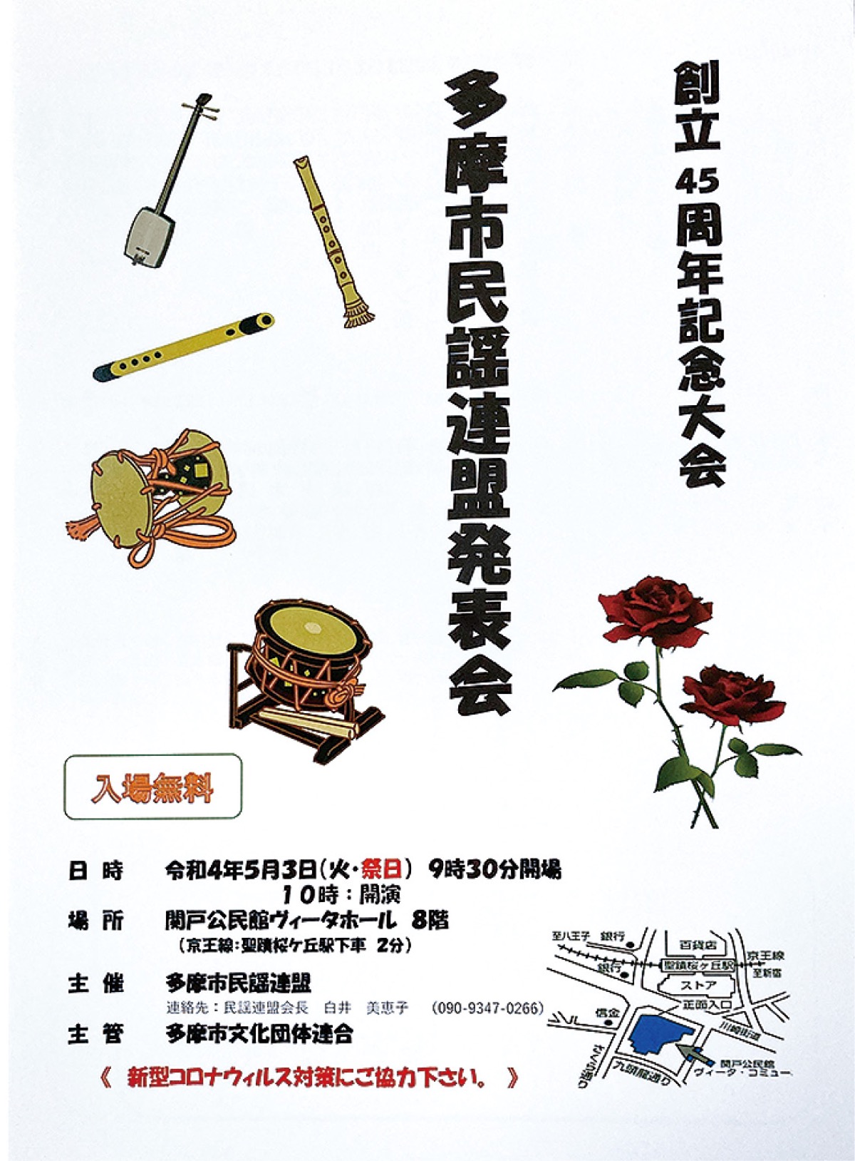民謡の愛好者らで構成される多摩市民謡連盟(白井美恵子会長=人物風土記で紹介=)は5月3日(祝・火)、関戸公民館ヴィータホールで創立45周年を記念する発表会を開く。