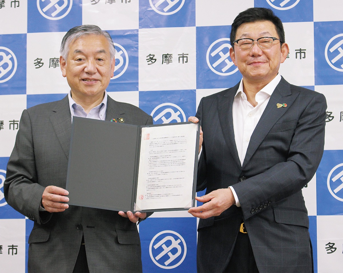 当日は同店を運営する株式会社悠煇(立川市)の岩谷東明・代表取締役が出席。阿部裕行・多摩市長と協定に関する各書を交わした。
