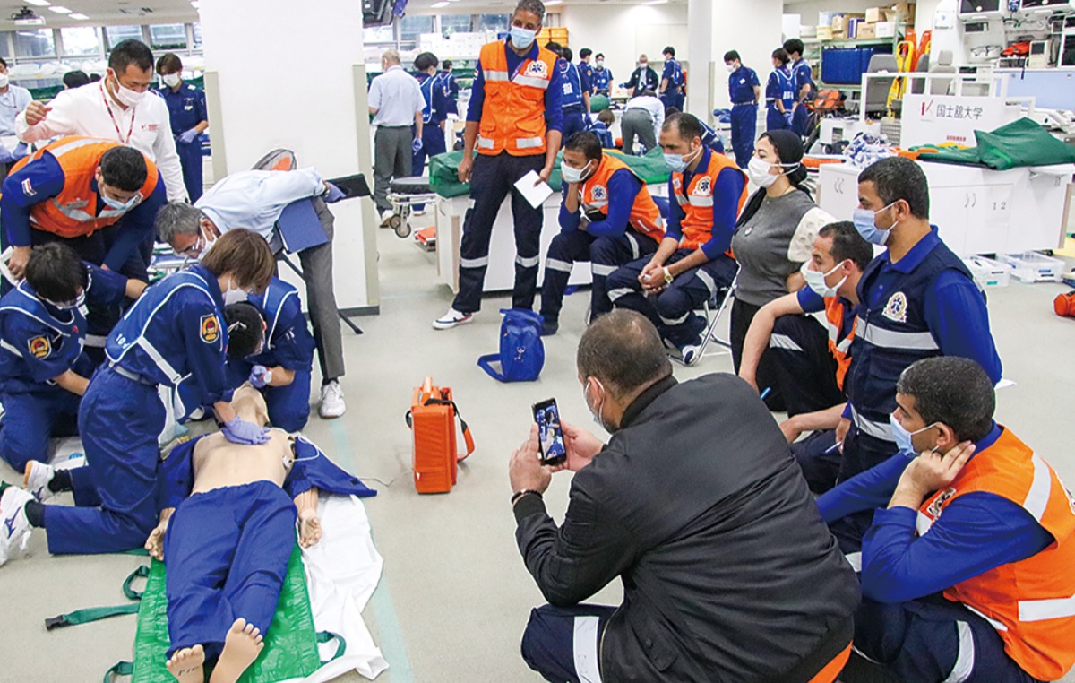 永山の国士舘大学で15日、エジプトの救急救命士が実習視察を行う様子の公開があった=写真。