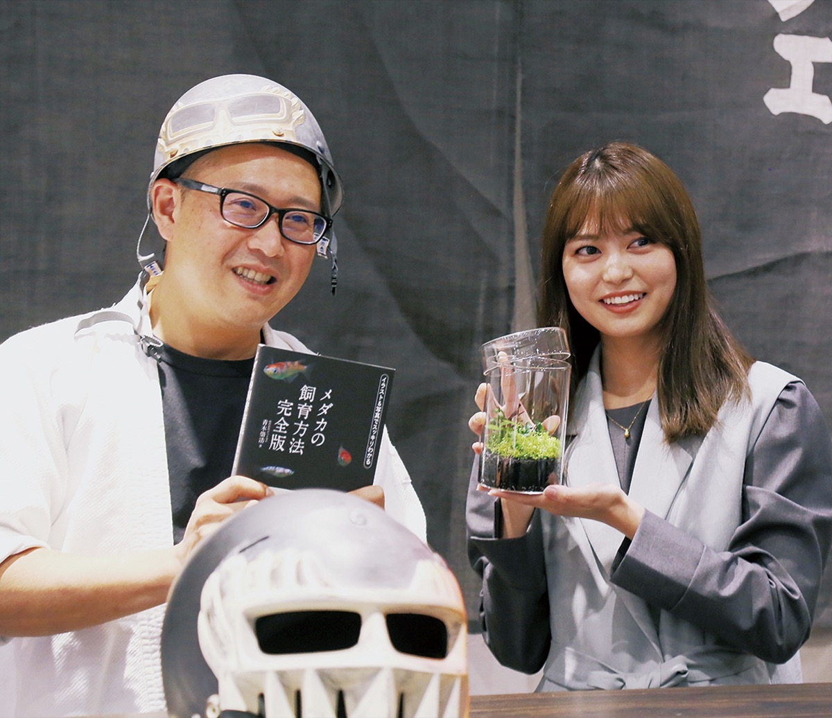 就労福祉事業の一環としてメダカ販売などを行い、障害がある人の社会復帰と経営を両立させたビジネスモデルを確立している同社。打ち上げる「めだか盆栽」は青木さんが作り上げたアクアリウムの一種で、メダカのフンや植物の光合成で水槽内の環境を保ち、できるだけ自然環境に近い状態を再現しているものという。