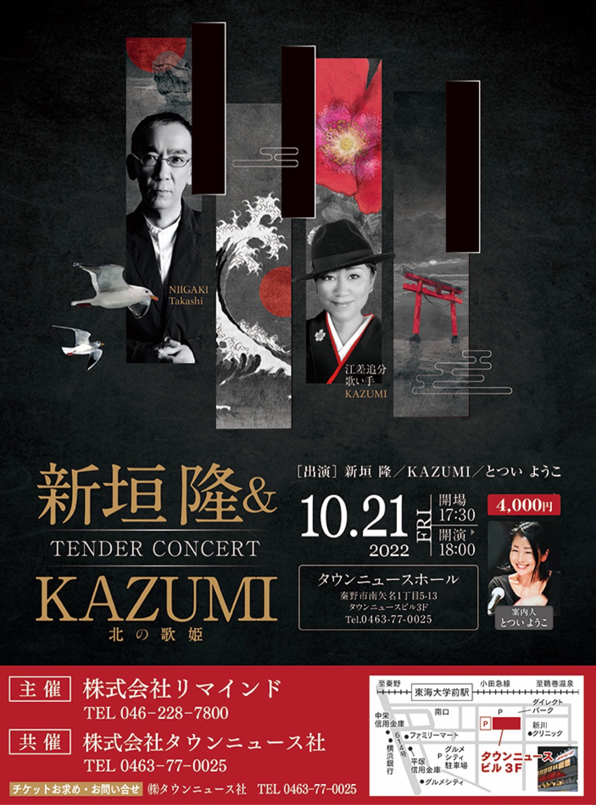 現代音楽家・新垣隆と北の歌姫KAZUMIの異色の組み合わせが実現。10月21日(金)、タウンニュースホール(小田急線東海大学前駅南口徒歩1分)で、”新垣隆と江差追分!意外な出会いが音楽界の事件となる”と題した「TENDER CONCERT 新垣隆&北の歌姫・KAZUMI」が開催される。主催は(株)リマインド(【電話】046・228・7800)。チケット料金4000円。購入はタウンニュースホール【電話】0463・77・0025へ。