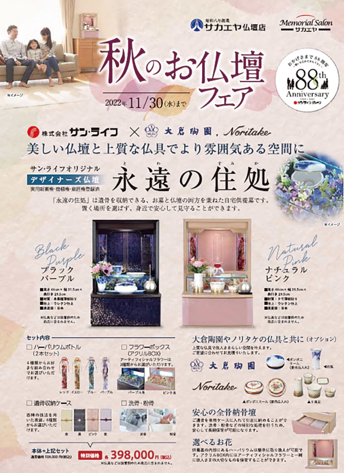 八王子市の葬儀ホール「サン・ライフ八王子北口ファミリーホール」内仏壇ショールームで現在、「秋のお仏壇フェア」が開かれている。