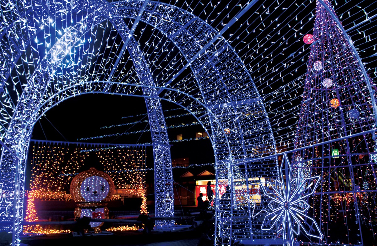 ブルーの光が道をつくり、幻想的な雰囲気を醸し出すなか、「光の道」を手をつないで歩く親子連れや、永山地区のキャラクター、永どんのイルミをスマートファンで撮影する学生らの姿などがみられる。
