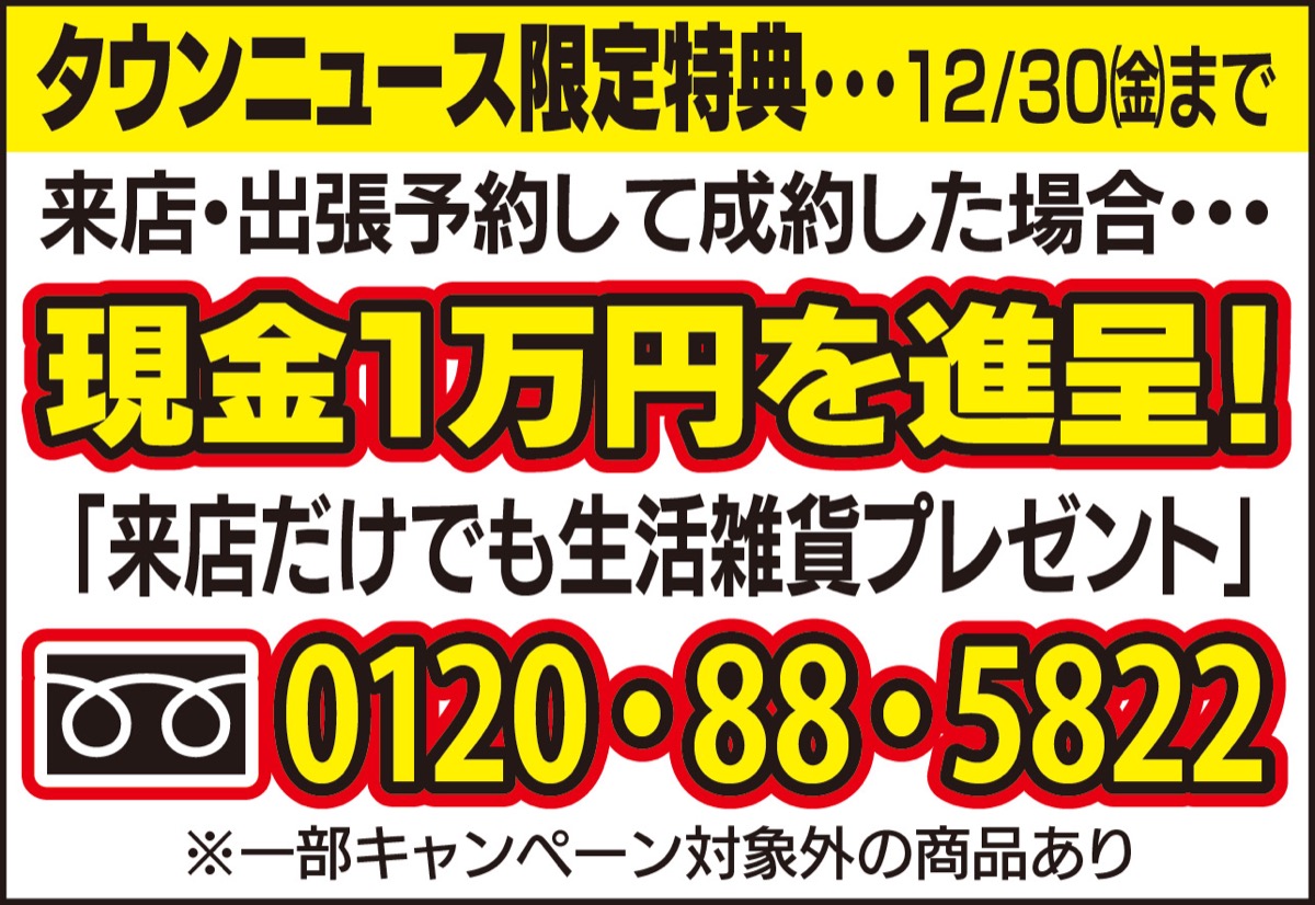 多摩の「暮らし応援隊」といえば、全国に店舗を構える買取店「おたからや」のザ・スクエア店。値上げが進む今、不要になった貴金属やバッグ、時計のほか、衣類、テレホンカードなども高価買取してくれ、「得した気分になる」との声を集めている。なかでも現在、査定依頼が増えているのが買取相場が最高値をつける金といい、「年末の買取強化中。12月は来店予約をされ、ご成約に至った場合には現金1万円を進呈させていただきます」と同店の徳永拓真店長。また、年内は暮らし応援企画として、「来店するだけで生活雑貨をプレゼント」と話している。