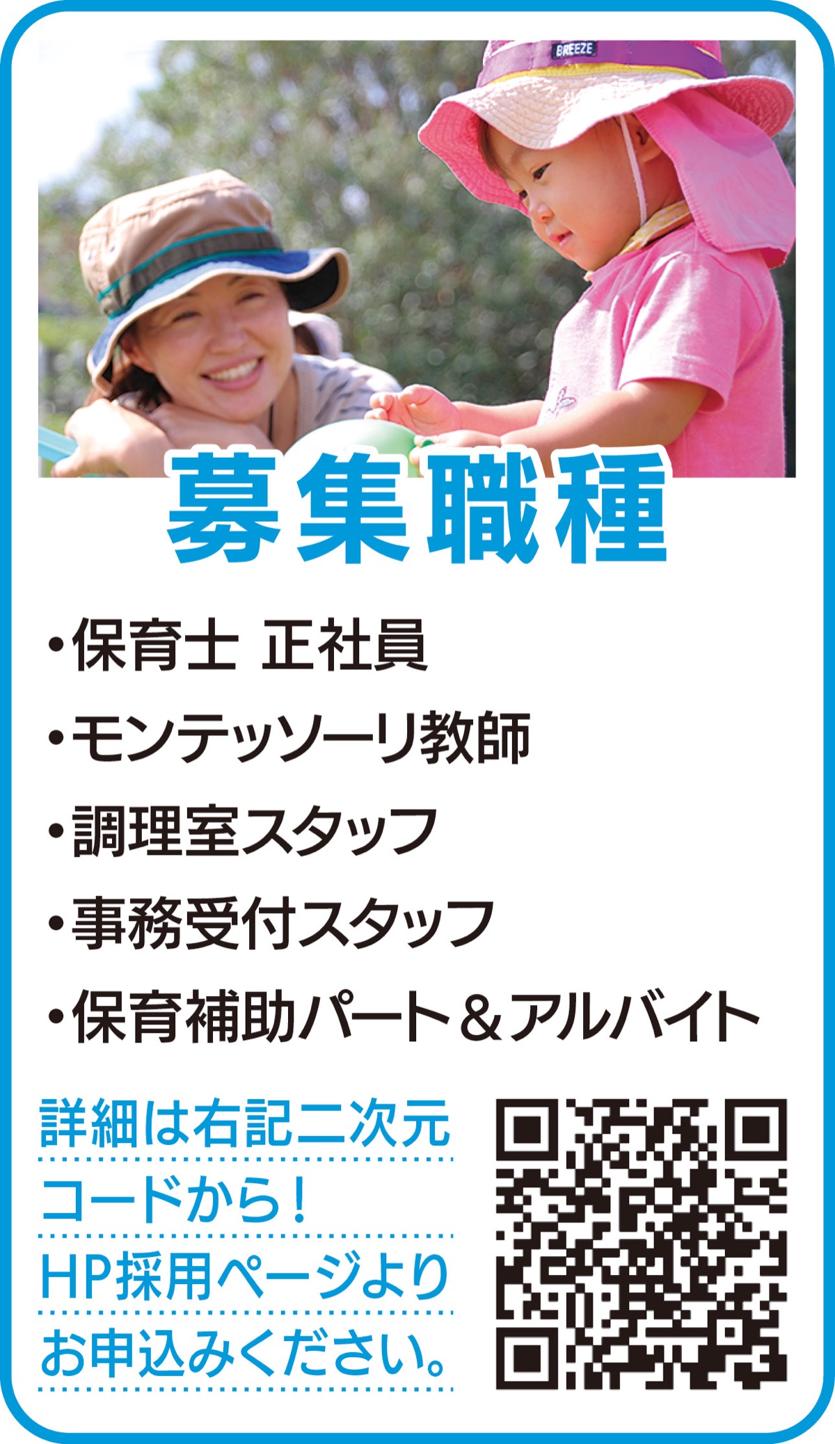 一方で、学童保育&コミュニティカフェも運営する同グループはモンテッソーリ教師や調理室、事務受付スタッフ、保育補助のパートアルバイトなどの職種でもスタッフ募集中という。「私たちが運営する施設はいずれも駅から徒歩圏内。個性に合わせたお仕事をお願いすることも可能です。お問い合わせ下さい」