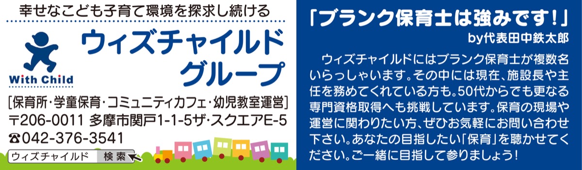 聖蹟桜ヶ丘駅の徒歩圏内で東京都認証保育所を3園、企業主導型保育園を運営する同グループ。各園の一般職から主任候補までを幅広く募る。新卒のほか未経験の社会人、学生、子育てのためにブランクのある人も歓迎といい、同グループ担当者は「年齢やこれまでの経験は二の次。チームの成長を目標にできる熱意のある方を求めています」と話している。