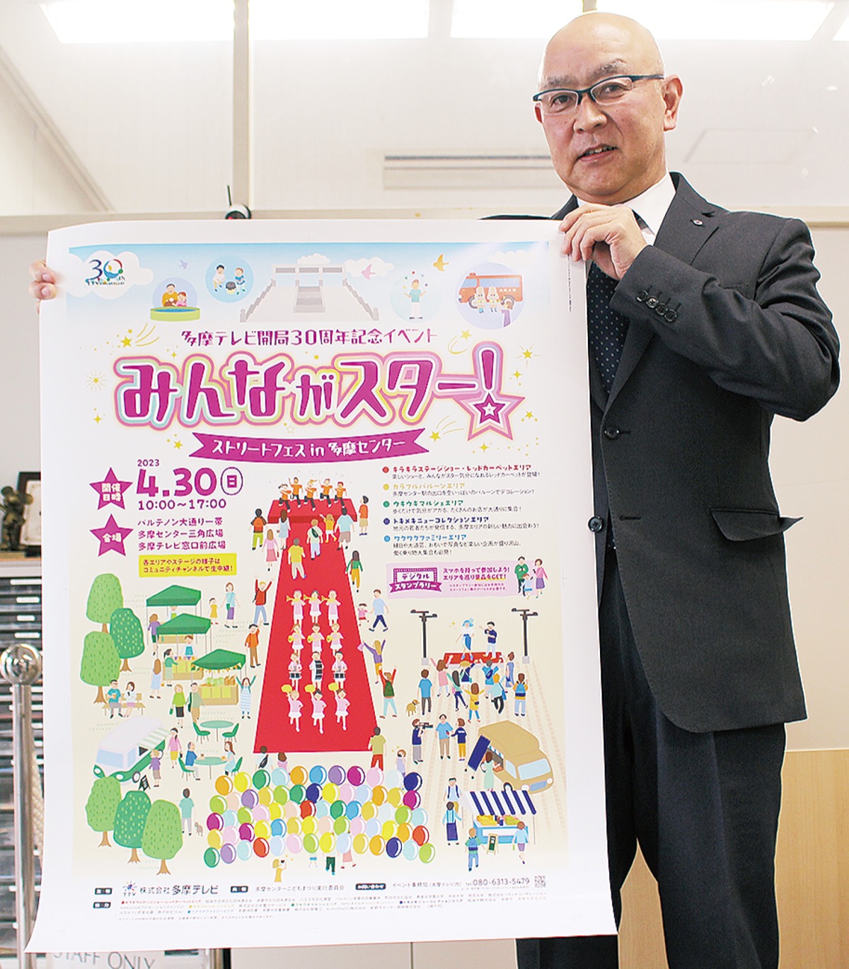 多摩ニュータウンエリアなどで視聴できるケーブルテレビ局の多摩テレビが4月、開局30周年を迎える。街の情報を伝え、ニュータウンエリアの地域コミュニティ形成に貢献してきた同局。運営する株式会社多摩テレビの齋藤健治代表は「今後はより視聴者を巻き込んだ番組づくりを進めていきたい」と話している。