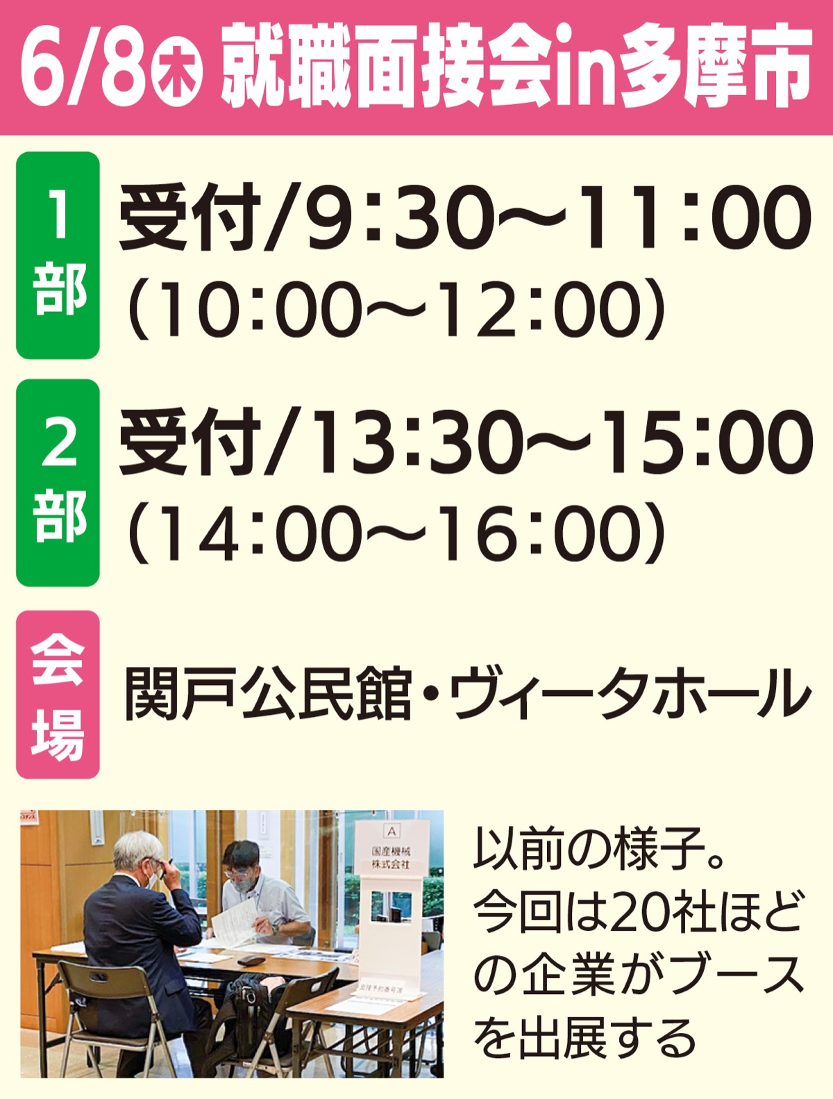 「書類選考なし」で全20社の企業にアプローチできる就職面接会が6月8日(木)、関戸公民館・ヴィータホールで開かれる。多摩地域の仕事探しを応援する東京しごとセンター多摩が主催するもので、全年齢層が対象。参加無料。時間は午前10時、午後2時からの2部制で各回50人(先着予約制)。担当者は「幅広い仕事が揃う。ご来場を」と話している。