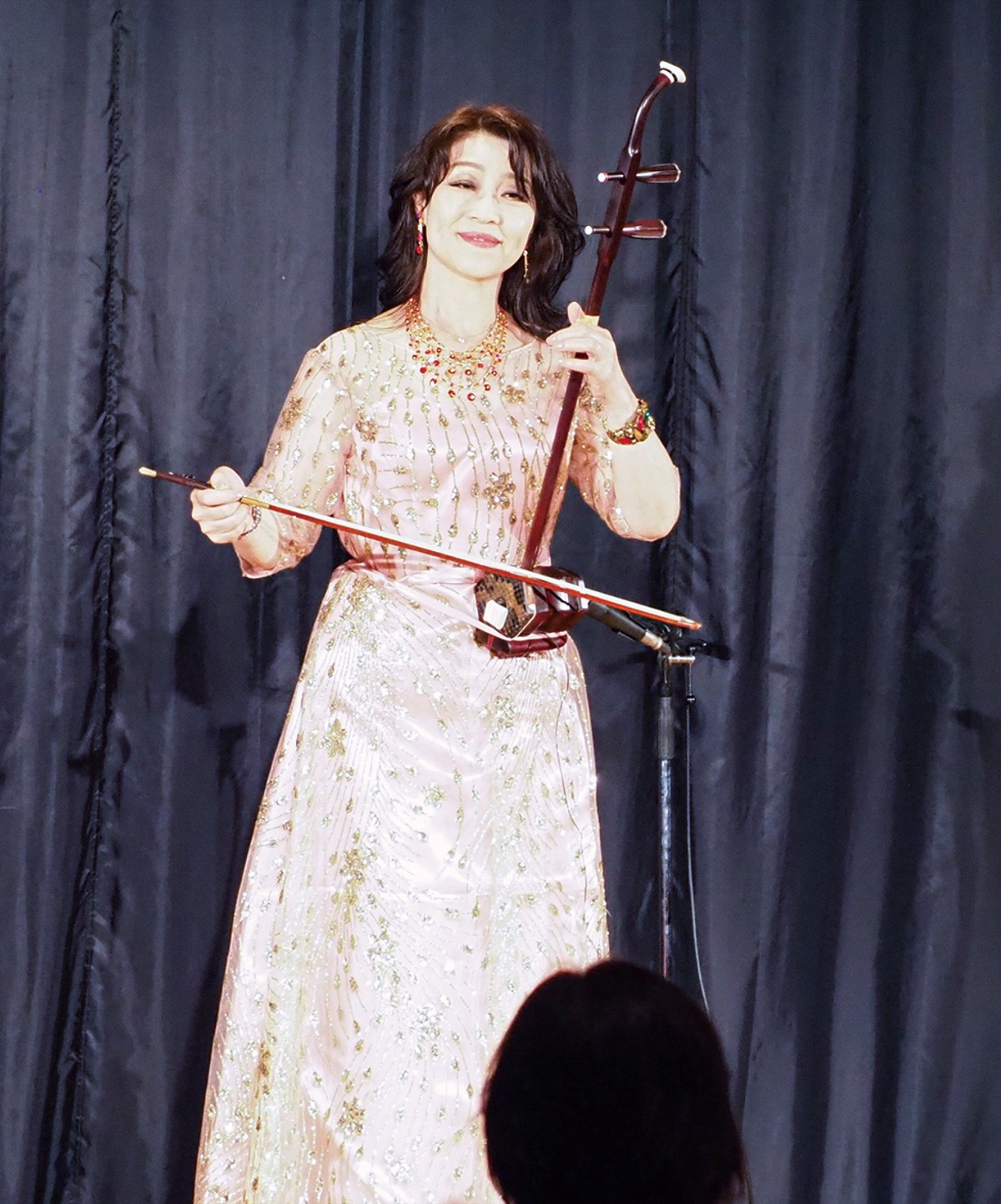 出演したのは二胡奏者で医学博士でもある姜暁艶(ジャン・シャオイェン)さん=写真。広島を拠点に活動しており、定期的にコンサートを開いている。当日は約80人の来場者があり、姜さんの奏でる二胡や鮮やかな衣装に魅了されていた。