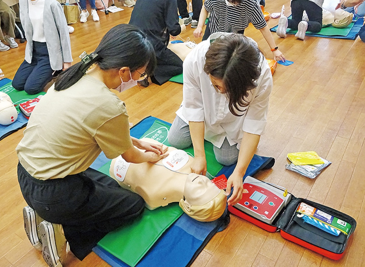 当日は同署の署員が講師となり、乳児や小さい子どもも対象とした救命講習として心肺蘇生方法やAEDの使い方=写真、異物除去の仕方、止血法などを参加者に教えていった。