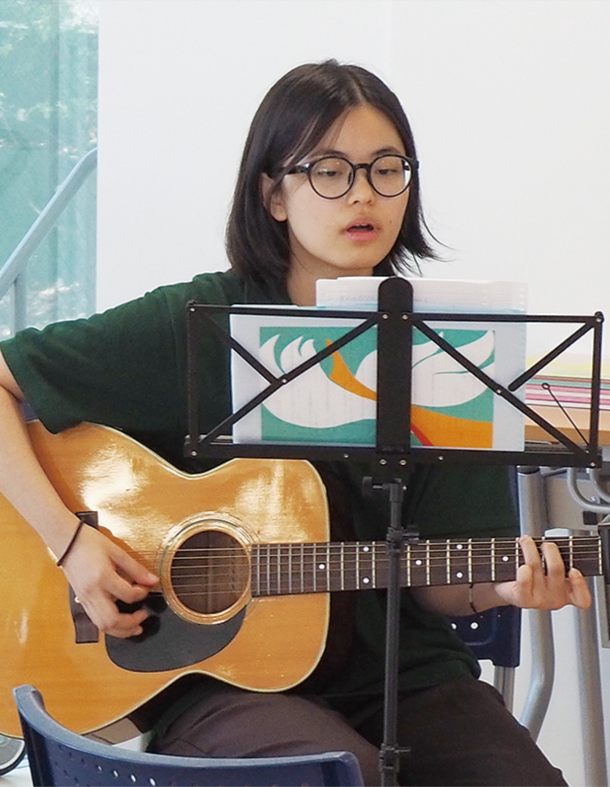 クプカの代表を務める山口優里さん=人物風土記で紹介=がギター伴奏を担当した合唱では、「翼をください」「一人の手」などを歌い、笑顔もあふれ会場が一体となった。