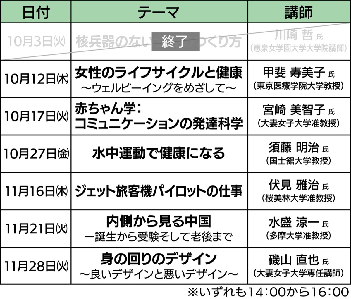 同公民館と市内にキャンパスを置く6大学(大妻女子大学・多摩大学・恵泉女学園大学・国士舘大学・東京医療学院大学・桜美林大学)が共催し、赤ちゃん学やウェルビーイング、ジェット機パイロットの仕事など、それぞれの大学の特性を生かした専門性の高い講座を展開することにより、市民の多様な学びの機会を提供する(講義概要は表参照)。
