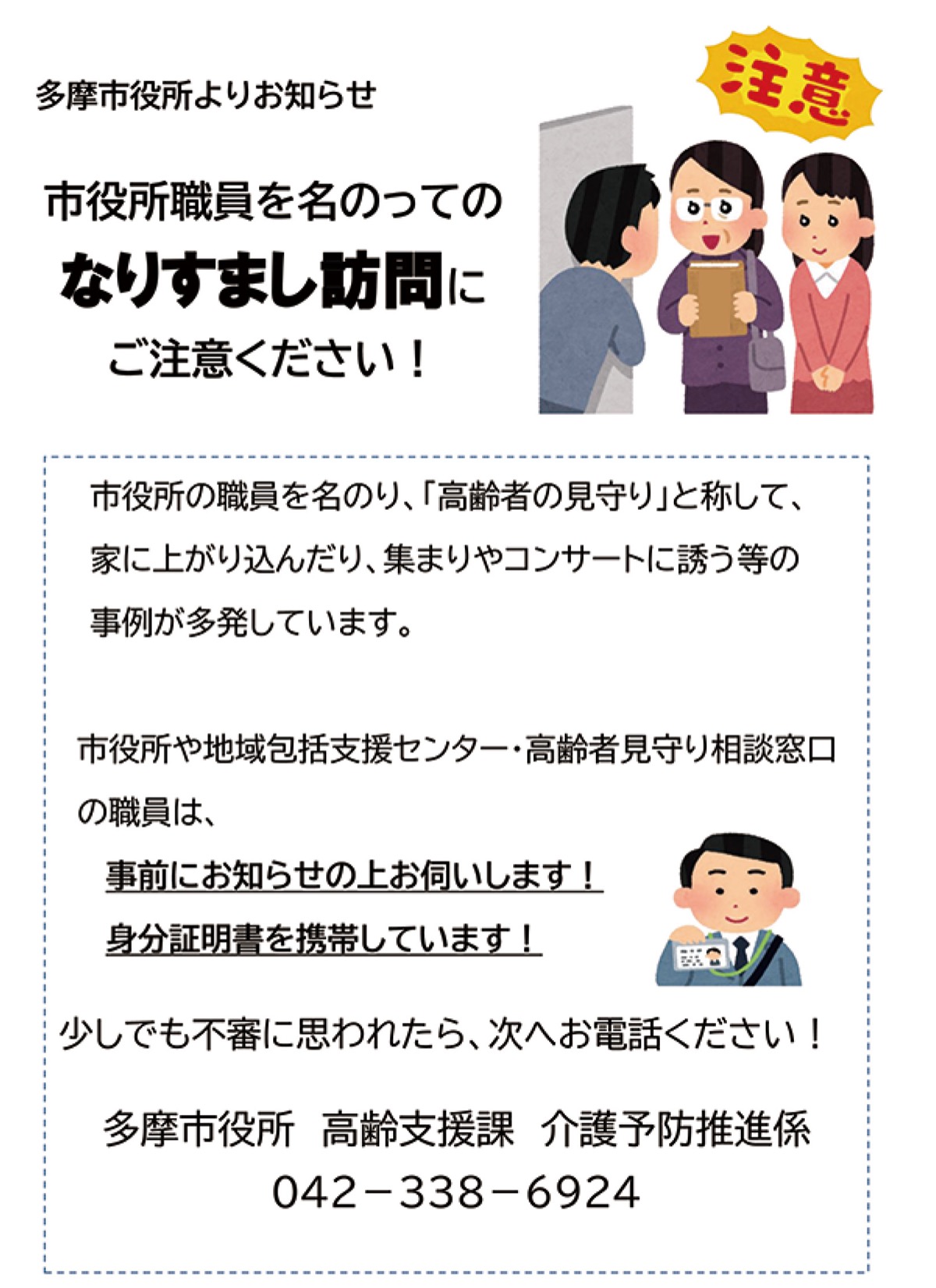 多摩市役所健康福祉部高齢支援課では現在、市役所職員を偽って名乗る「なりすまし訪問」に注意を呼びかけている。市は、永山地区にある一人暮らしの高齢者宅に宗教法人に関係のある人物が複数回訪問し、同法人の会場で行われるコンサートに勧誘するという事案が発生したとして警戒を強めている。