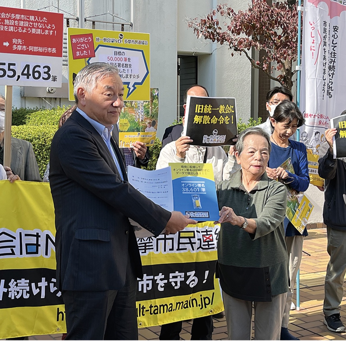 宗教法人世界平和統一家庭連合(旧統一教会)が市内永山の土地を取得し、建設を予定している件について、「統一教会はNO!多摩市連絡会(佐久間む津美・神子島健共同代表)」は10月27日、多摩市役所を訪れ、「旧統一教会」施設建設中止を求める署名を阿部裕行市長に手渡した。