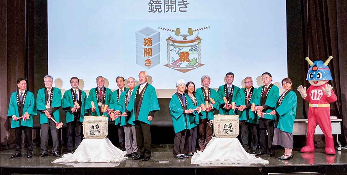 峯岸会長は「多摩消防懇話会は長きにわたり消防署とともに歩んできた。多摩ニュータウンの発展とともに災害や救急への需要も高まっている。活動が半世紀を過ぎ、未来への新たな一歩として歩んでいきたい」とあいさつした。その後は、鏡開き=写真=やヴァイオリン演奏といったステージなどが行われ盛大に50周年を祝った。