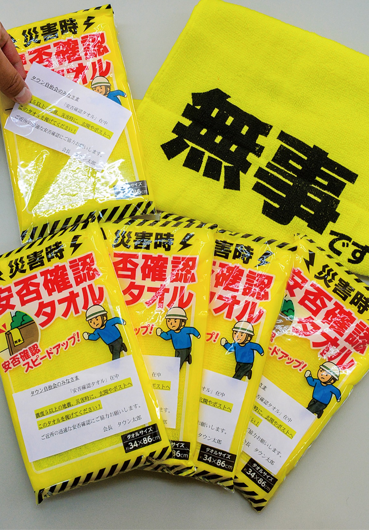 タウンニュース社では自治会町内会向けに安否確認タオルの注文を受付中(240枚〜で、1枚税込297円)。(問)タウンニュース社営業推進部【電話】045・913・4141(土日除く、9時〜18時)。