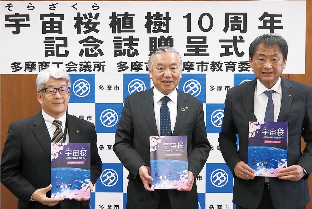 「多摩桜プロジェクト」を推進する多摩商工会議所(伊野弘明会頭)は、宇宙を旅した「宇宙桜(そらざくら)」の植樹10周年を記念した記念誌を発行した。この記念誌を市に500冊寄贈することになり、1月26日に市役所で贈呈式が行われた。