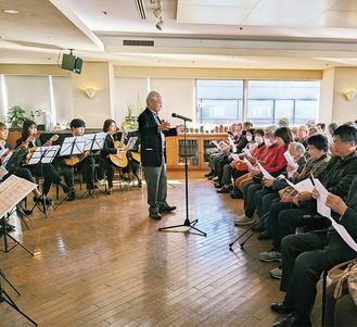 110年の歴史がある早大マンドリン楽部。当日は11人が演奏に参加した。そして、早大応援歌「紺碧の空」をはじめ、学生時代、オー・シャンゼリゼ、ビートルズナンバーなどの名曲が披露された。また、参加者全員で「寒い朝」や「ふるさと」を合唱し、会場は大いに盛り上がった。同会の尾ノ井光昭会長は「来場された方々は、質の高い演奏で、名曲を十分に堪能していただいたようで良かった」と話していた。