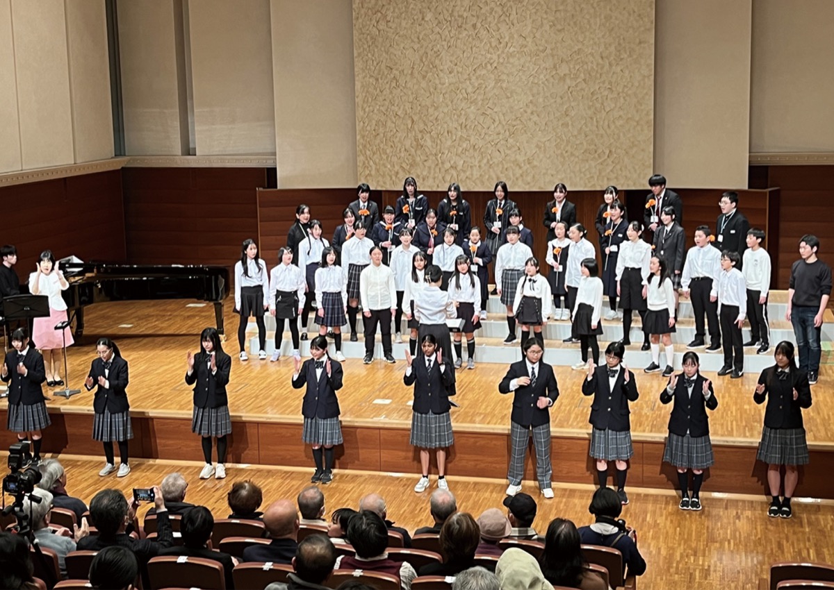 二部では、合唱団や第一小、多摩中のメンバーによる合唱や手話歌が披露され、最後は出演者全員で「未来の光へ」を合唱した。ピアノ伴奏は交流企画に関わってきた吉本元汰さんと同級生の渋下さん(譜めくり)が務めた。