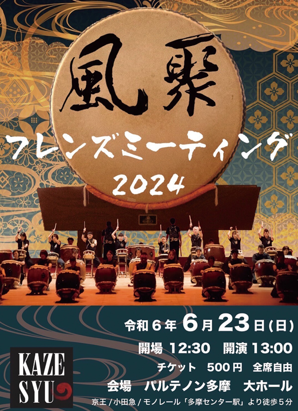 風聚(かぜしゅう)フレンズミーティング2024が6月23日(日)、パルテノン多摩大ホールで開催される。午後1時開演(12時30分開場)。和太鼓集団「風聚」のメンバーが指導もしくは所属している和太鼓団体が一堂に会して、それぞれの個性を発揮した演奏を披露していく。