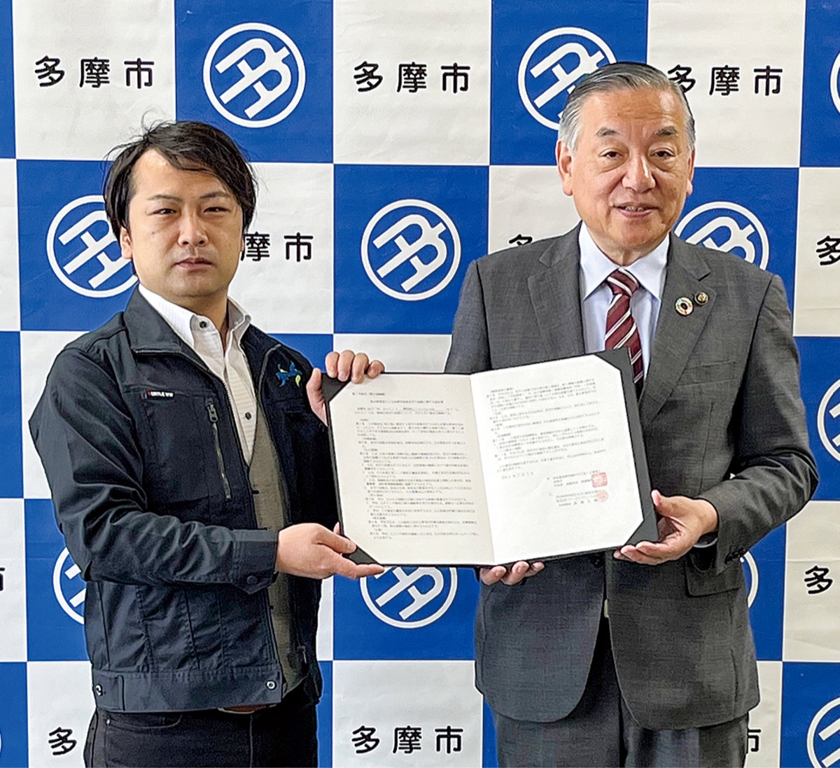 多摩市はこのほど、株式会社ファーストソリューション(愛宕)と地域見守り活動で連携する協定を締結。同社の高橋大輔代表取締役と小田原衛生グループの取締役で同社経営顧問の山崎剛一さんが5月9日、市役所を訪れ、阿部裕行市長と協定締結式を行った。