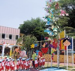 同園では、大切な幼児期に本物体験の積み重ねの一環として、四季折々のイベントを子どもたちと楽しみながら行っている。七夕には大きな竹に短冊をつけ=写真下、七夕の歌を園内外に響くように元気に歌っていた。