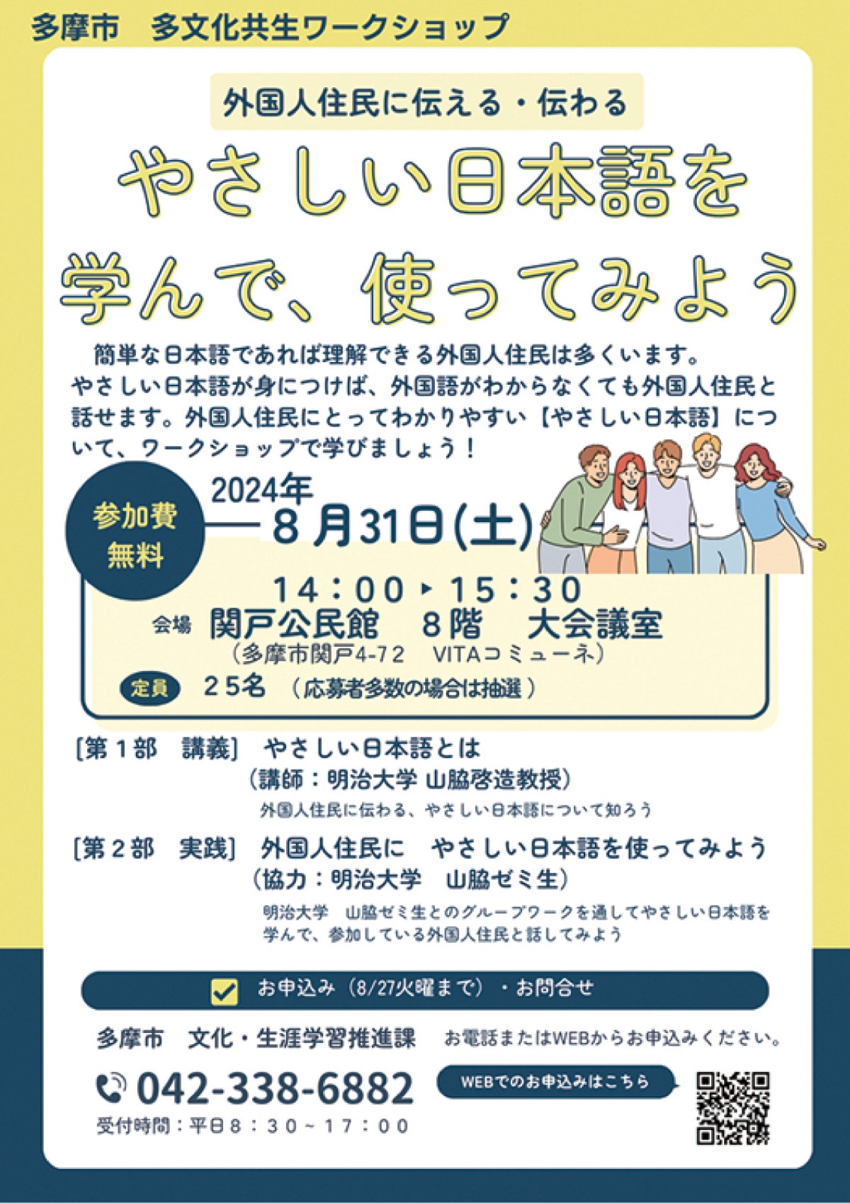 第1部では明治大学の山脇啓造教授を講師に招き、「やさしい日本語とは」をテーマに講義を行う。第2部では、明治大学山脇ゼミ生の協力のもと、外国人住民にやさしい日本語を使ってみようと題し、グループワークを通して参加している外国人住民との会話を実践する。定員は25人(応募多数の場合は抽選)。申込み期限は8月27日(火)。申込みは市文化・生涯学習推進課【電話】042・338・6882。