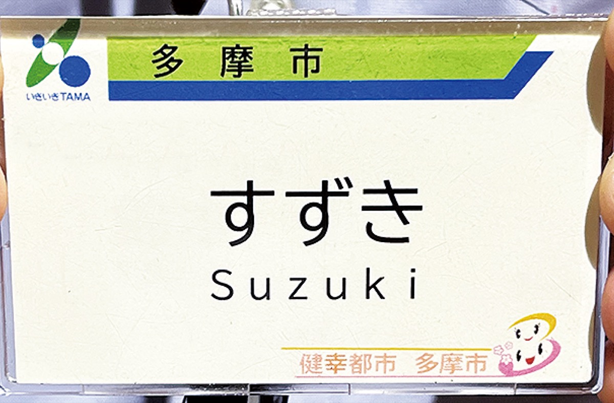多摩市はこのほど、職員の名札の表記をフルネームから名字(ひらがな・ローマ字)のみに変更した=写真。DXの推進により非対面型の行政手続きが増える一方、社会課題の複雑化や多様化、高齢化が進行していることから、対面型の住民サービスの必要性も高まっていることを踏まえ、より親しみやすい名札に変えたという。
