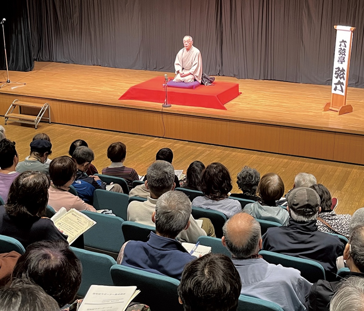 認知症の基礎知識とさりげなく寄り添う接し方のポイントを学ぶ。落語は「多摩落語寝床の会」の六弦亭弦六さん=人物風土記で紹介=と紋雁亭柴奴さんが高座にあがる。落語付きの講座は6月に初めて開催し、多くの来場者で好評だった。