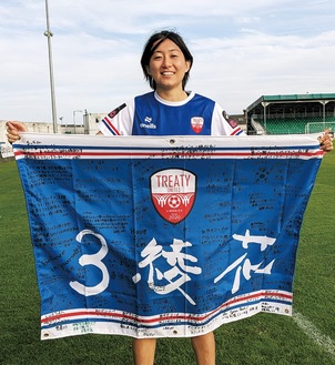 アイルランドの女子プロサッカーリーグで奮闘中の町田市出身の池座綾花さんに先ごろ、応援メッセージが書かれたフラッグが届けられた=写真。